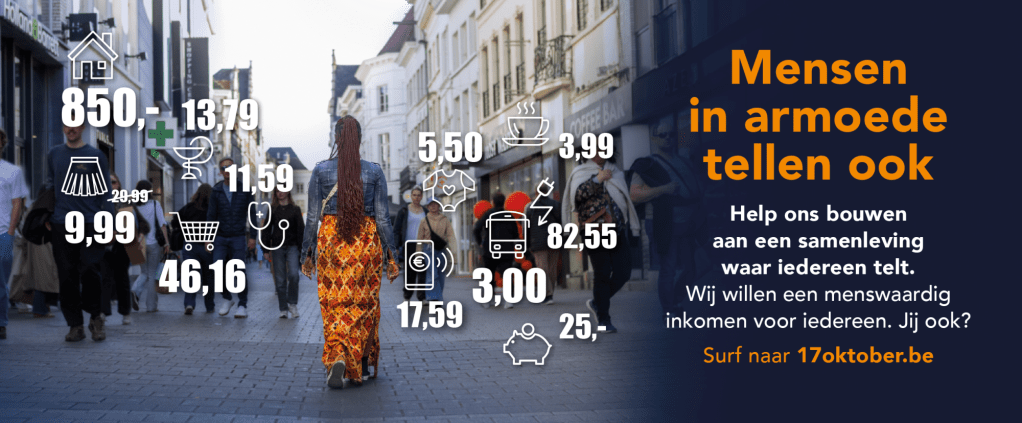 In de aanloop naar de Werelddag van Verzet tegen Armoede op 17 oktober voeren het Netwerk tegen Armoede en de lokale armoedeverenigingen actie voor het recht op menswaardig inkomen. Mensen in armoede moeten niet alleen constant tellen. Ze zijn vaak bezig met óverleven, door een gebrek aan middelen maar ook vaak door sociale uitsluiting. Wij pleiten voor een inkomen boven de armoedegrens voor iedereen om een menswaardig leven te kunnen leiden. De rechten van mensen in armoede en de sociale zekerheid staan onder druk. Daarom laten we de stem van mensen in armoede horen. Mensen in armoede tellen ook! We hebben samen met mensen in armoede enkele aanbevelingen uitgewerkt waarmee we lokaal kunnen werken aan een menswaardig inkomen.
